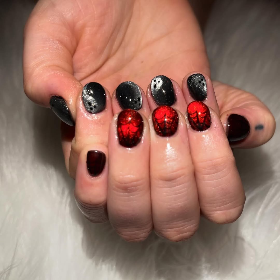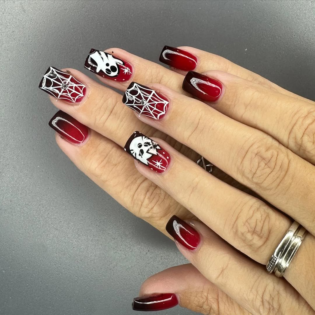 @orchardnails delivers a punchy red-and-black combo that’s dripping in drama. The ombré base melts from blood red to deep black, topped with spiderwebs, tiny ghosts, and skulls. It’s spooky glam in the most Instagram-worthy way.