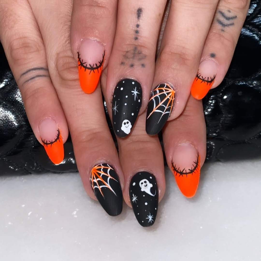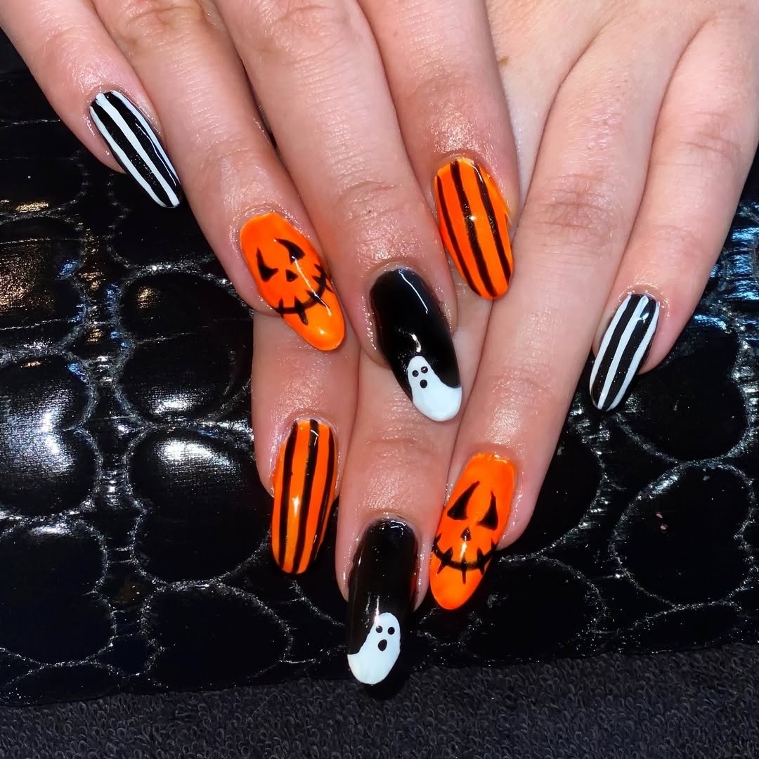 This one’s for the Halloween purists. Classic jack-o’-lantern orange, black stripes, and a little friendly ghost action—@kandknailsponcacity proves you don’t need the bells and whistles for a fun, festive moment.