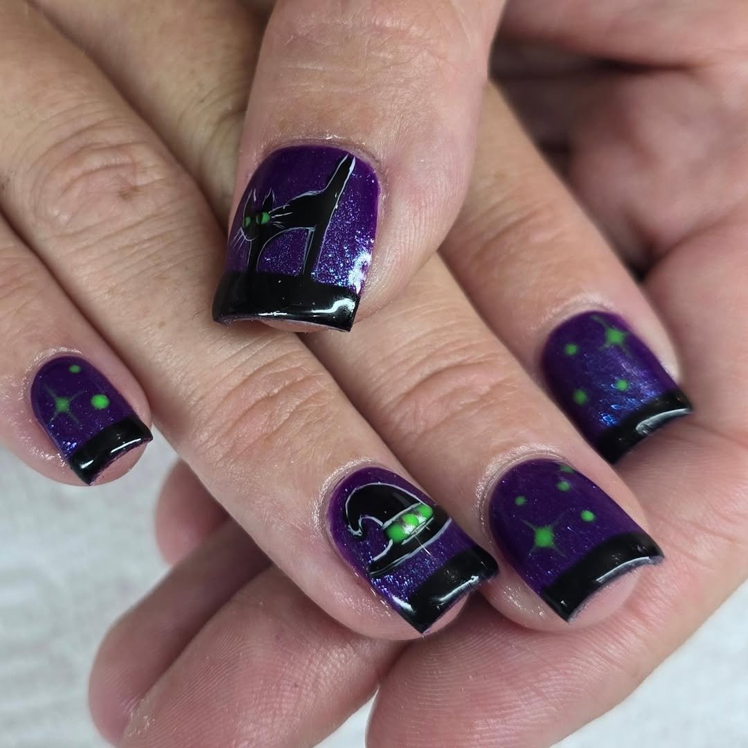 We’ve officially found the cutest coven in town. @gypsy.nail.girl’s short square nails get the glam-witch treatment in sparkly violet, with pops of green stars and mini hat and cat details. It’s Halloween without the horror—a little more Hocus Pocus, a little less haunted house.