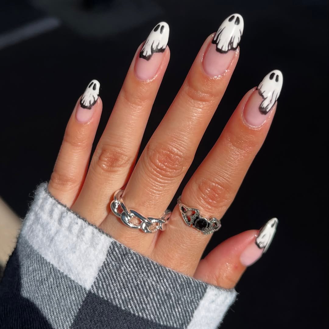 These little spirits might be the cutest things to ever haunt your fingertips. @cre8withcass brings out playful ghosts floating over sheer pink bases, and somehow, they still manage to look elevated. The white detailing is bold but soft—think Casper meets high-gloss editorial.