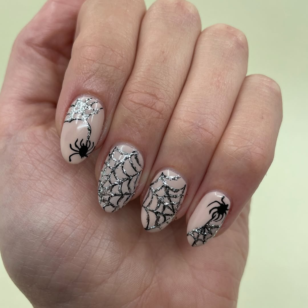 These sparkling spiderwebs on a sheer nude base are a glam take on spooky season. With jet-black spiders anchoring the look, it’s a perfect mix of delicate and daring. There’s something slightly ethereal about the way the webs catch the light.