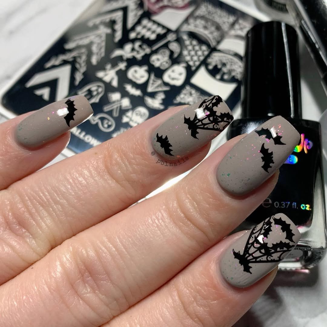 We’re calling it: spooky minimalism is having a moment. These matte grey nails by @pblnails bring haunted elegance with dainty black bats and cobwebs stamped across soft shimmer-flecked polish. It’s the kind of design that feels wearable for the whole month—not just the 31st.