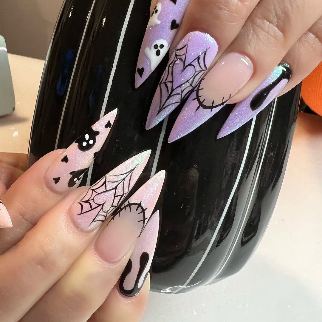 Who says Halloween can’t shimmer? This dreamy set from @beautybyhillsxx brings a pastel twist to the season with lavender ombré, glitter overlays, and spooky-chic black graphics. The spiderwebs, skulls, and stitched hearts keep things seasonal, but the sparkle gives it a sweet-meets-spooky energy.
