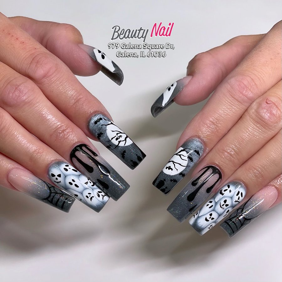 This spooky set is Halloween glam at its most theatrical—ombre ghost gradients, full moon silhouettes, dripping black lacquer, and glitter-kissed shadows. @beautynailgalena didn’t come to play; she came to haunt. The long coffin shape makes it feel even more dramatic, almost like tiny canvases telling a haunted bedtime story.