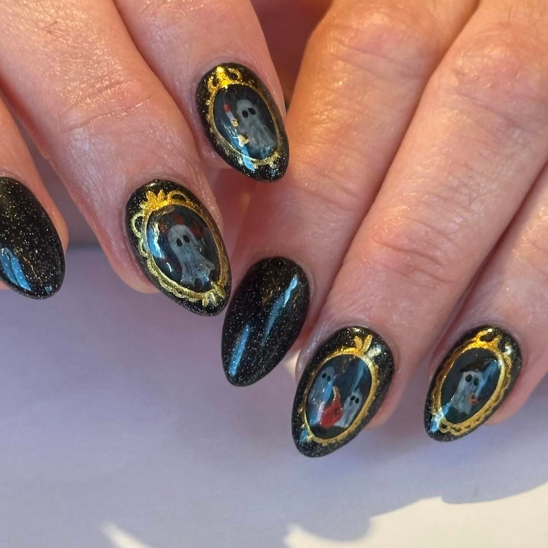 These nails are giving Victorian séance energy in the best way. Framed mini ghost paintings sit on a sparkly black background, each surrounded by delicate gold scrollwork.