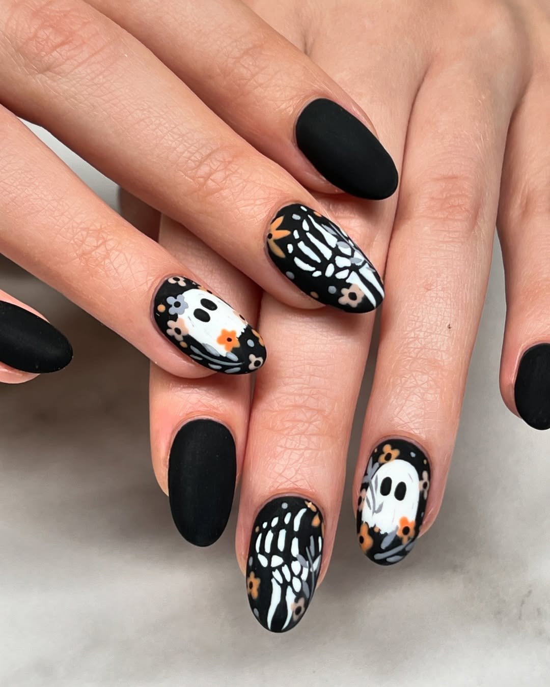 Floral ghosts, skeletal silhouettes, and a velvety matte finish—@dippednailstudiomd takes spooky season into soft goth territory, and it’s a whole mood. These nails don’t shout Halloween—they murmur it from beneath a cashmere shawl.