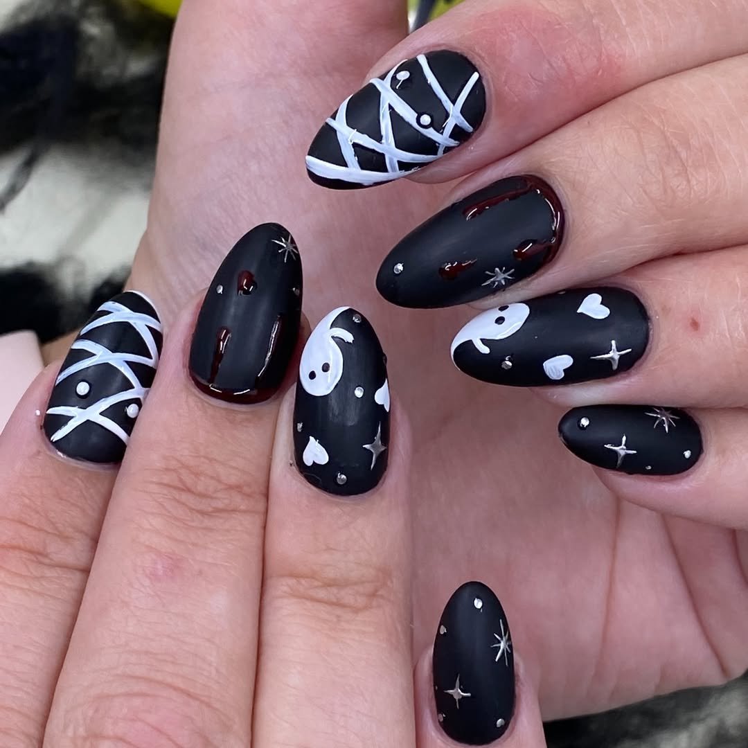 This all-matte black set from @onyxaesthetics is subtle in palette, but rich in charm. Mini white ghosts, tiny hearts, and delicate sparkles play across almond-shaped nails. A few blood drips add just enough edge to keep things interesting.