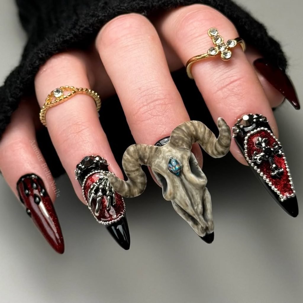 This is what happens when gothic romance meets baroque nail fantasy. @amourbellenails_ delivers a sinister masterpiece with raised textures, glinting red glitter, and literal 3D elements like a ram’s skull that looks like it belongs on a haunted altar. It’s Halloween, elevated to fine art.