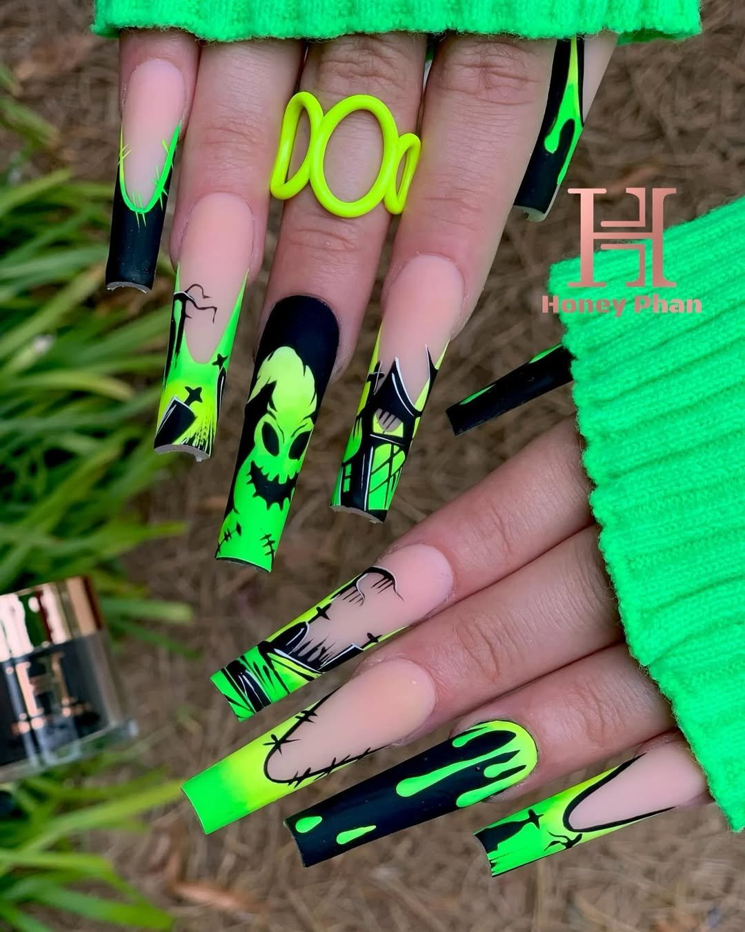 These nails are pure Halloween chaos—in the chicest way. @hnnailsbyhoney went all in with this high-drama, high-glow Oogie Boogie set that leans into electric greens, stitched silhouettes, and haunted house vibes. The matte finish adds a velvety contrast to the eerie glow, and that character art? Next-level detail.