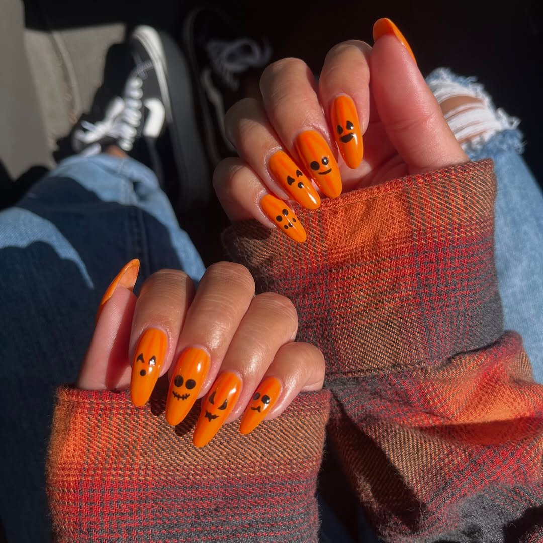 These cheery jack-o’-lanterns are here for a good time, not a long time. @cre8withcass goes full-on classic with vivid orange polish and playful pumpkin faces that practically beam with personality. The almond shape gives it a sleek modernity, but the energy? Totally nostalgic.