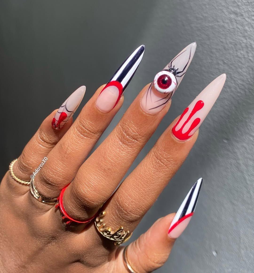 @adoreaxo’s set feels like a horror short story in nail form—and we’re here for the drama. Glossy, exaggerated stilettos become the canvas for slick black-and-white stripes, seeping blood-red drips, and a hyper-realistic 3D eyeball that straight-up stares back at you. It’s equal parts graphic novel and haute horror couture.