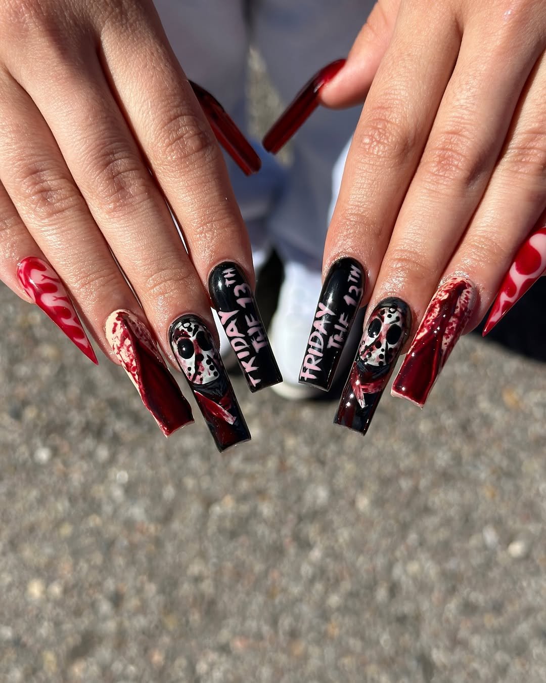These nails are giving full-on horror movie energy—and we’re here for it. @nailz.krystal went all in with a Friday the 13th theme, complete with Jason masks, blood drips, and that iconic lettering that just screams spooky season. The stiletto length and ultra-glossy finish only add to the drama.