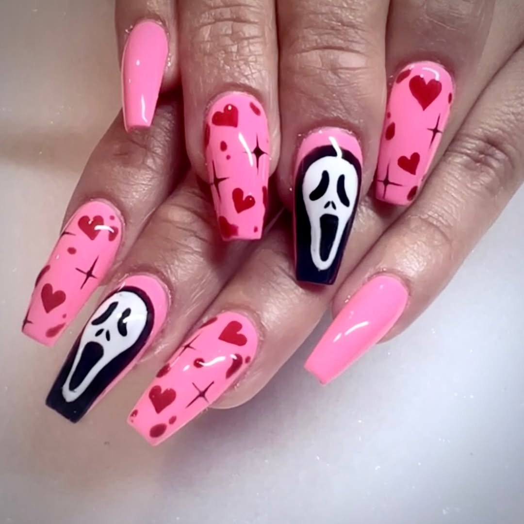 Okay, tell me this isn’t Scream meets Valentine’s Day in the best possible way. This mani by @beautybyhillsxx is pure camp with a twist—Scream masks floating on glossy pink nails surrounded by bright red hearts and playful sparkles. It’s absurd in all the right ways.