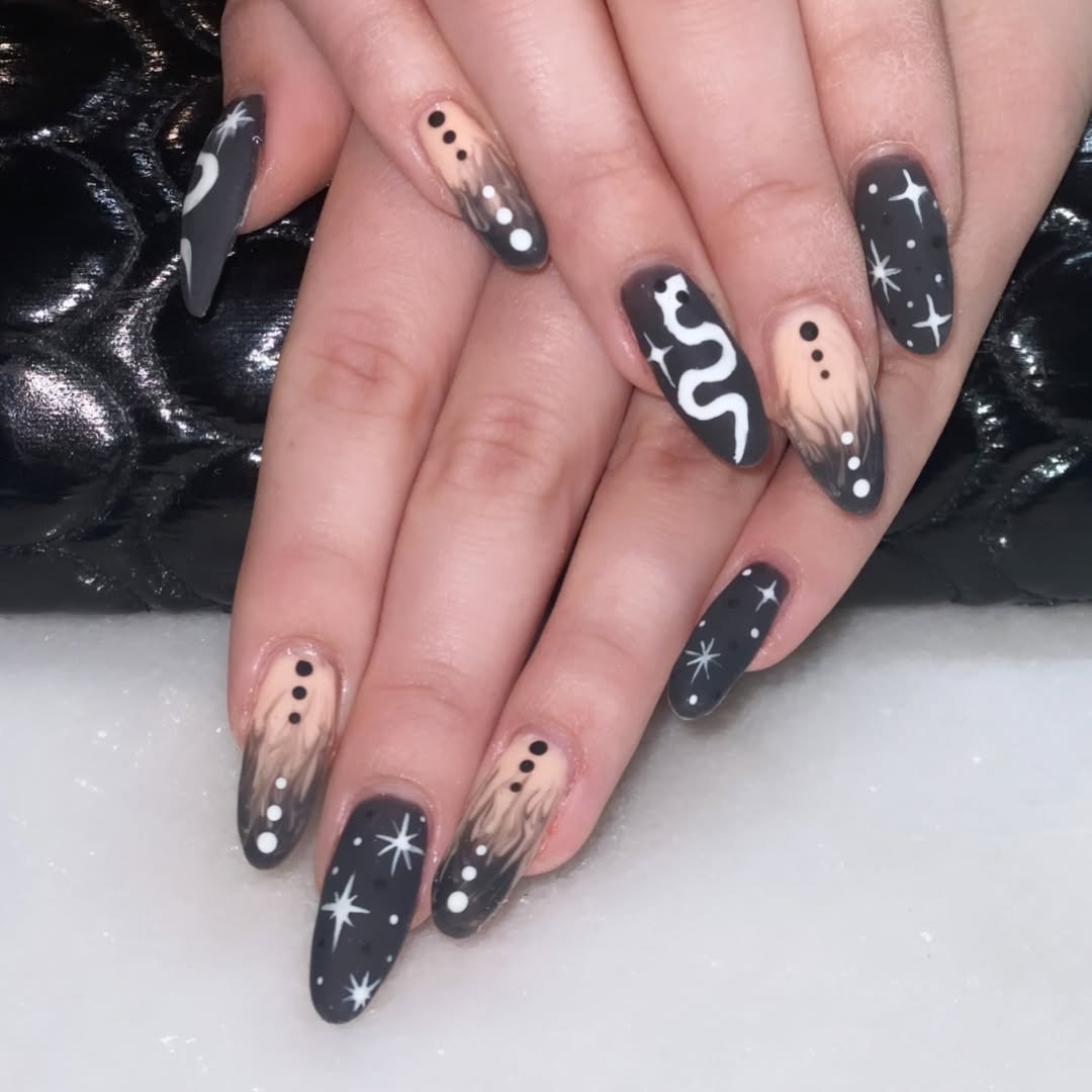 This one’s giving witchy ritual by candlelight. The smoky black gradient with nude undertones is mysterious and moody, while those tiny dots and constellation details feel cosmic and intentional. And let’s not ignore the sleek white snake slithering through it all—major mystic energy.