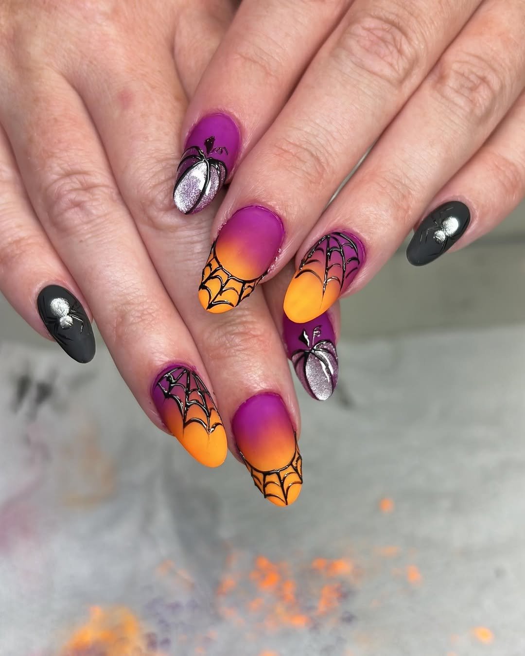This gradient set from @nailz.krystal is practically spellbound. The ombré effect from violet to orange feels like a Halloween sunset, while those silver spiders add a little edge.