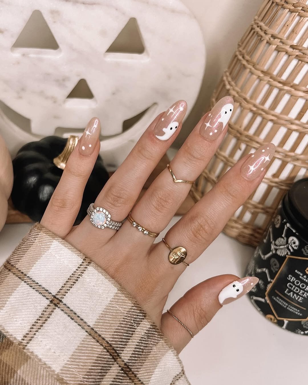 Between the soft background and crisp white details, this look feels like a pumpkin spice latte in nail form. Add the gold rings and plaid cuff? Suddenly, you’re the main character in a very chic October montage.