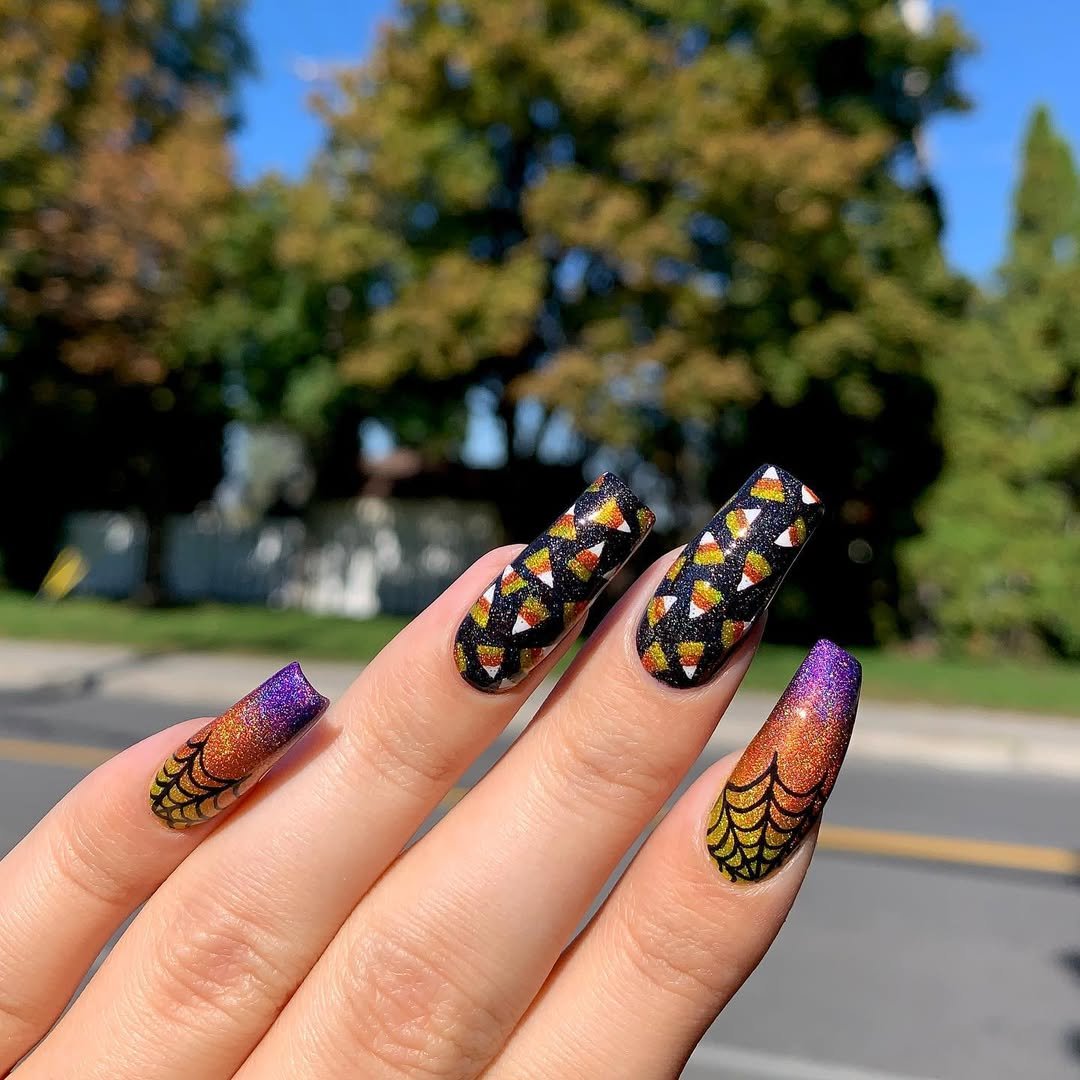Glitter lovers, this one’s for you. @nails.fern blends Halloween hues into a gradient of sparkly webs and candy corn confetti that catches the light like a disco pumpkin.