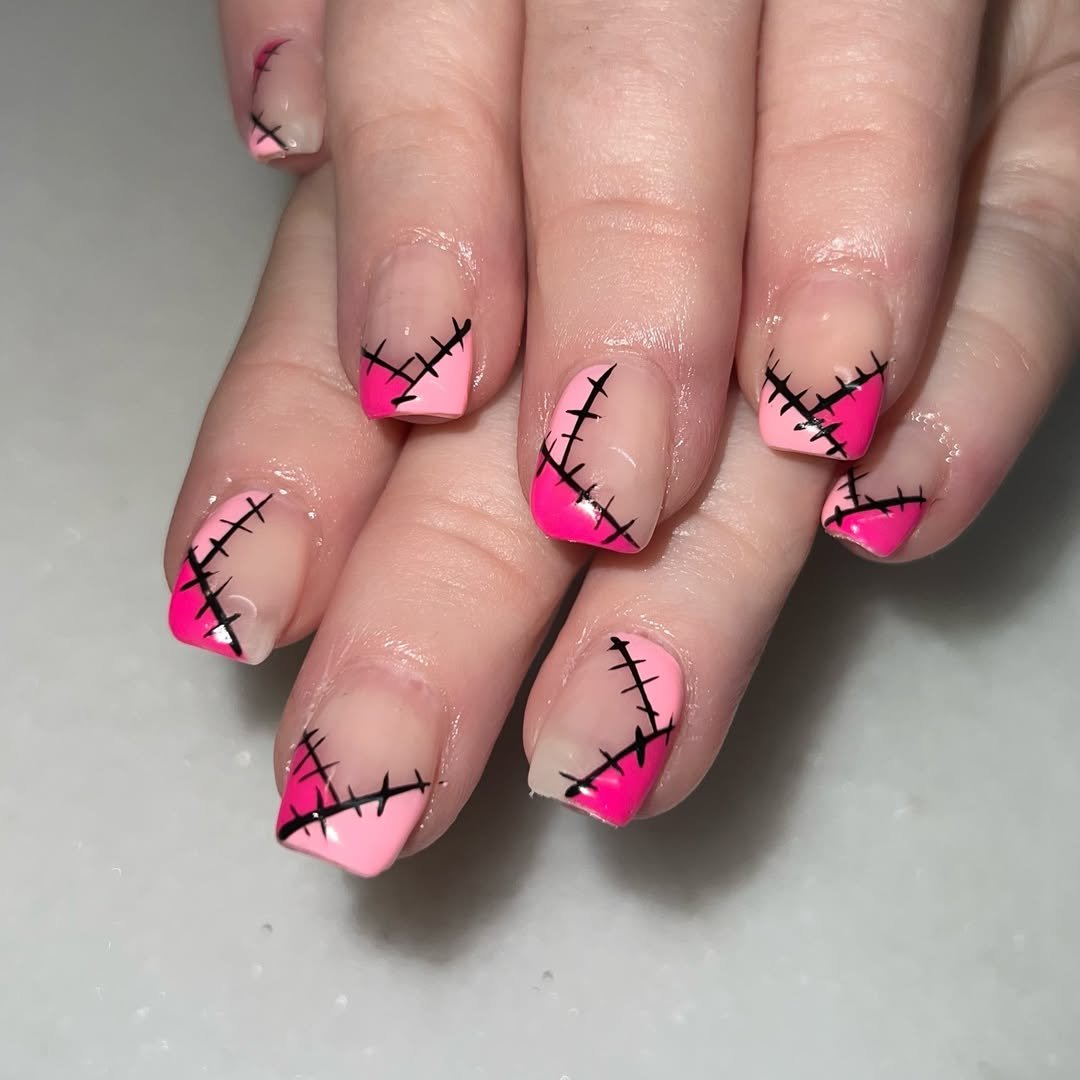 These shorties pack a punch. A sweet blush base with hot pink tips is “pretty in pink” at first glance—until you catch the black stitches running across each nail. It’s giving Frankenstein’s sweetheart, and I’m here for it.