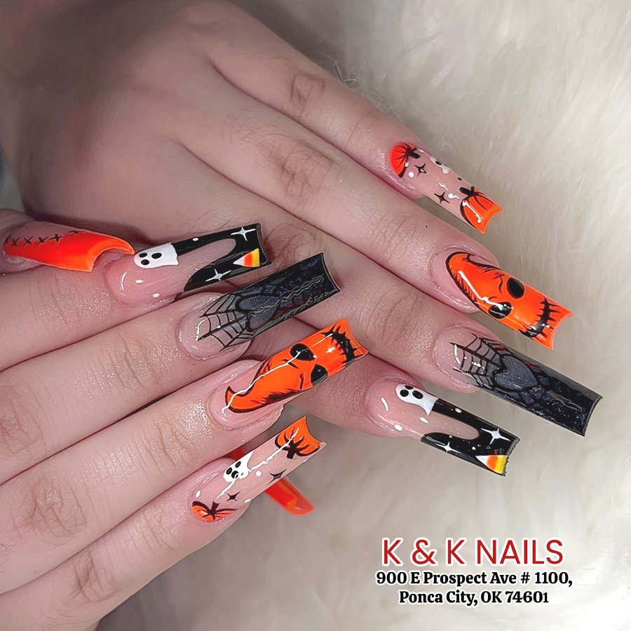 If Halloween candy had a manicure, this would be it. Orange flames, spiders, sparkly webs, and even a sneaky ghost or two make this bold mani from @kandknailsponcacity feel like a full October party on your fingertips.