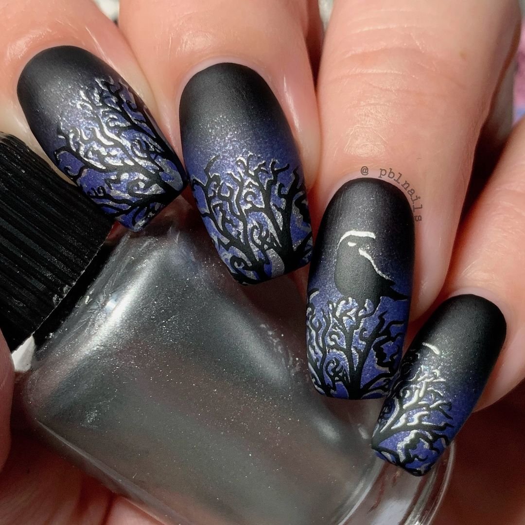 File this one under gothic romance. @pueencosmetics paints a stormy twilight scene with black trees creeping over silver-violet ombré. That little raven perched among the branches? Chef’s kiss.