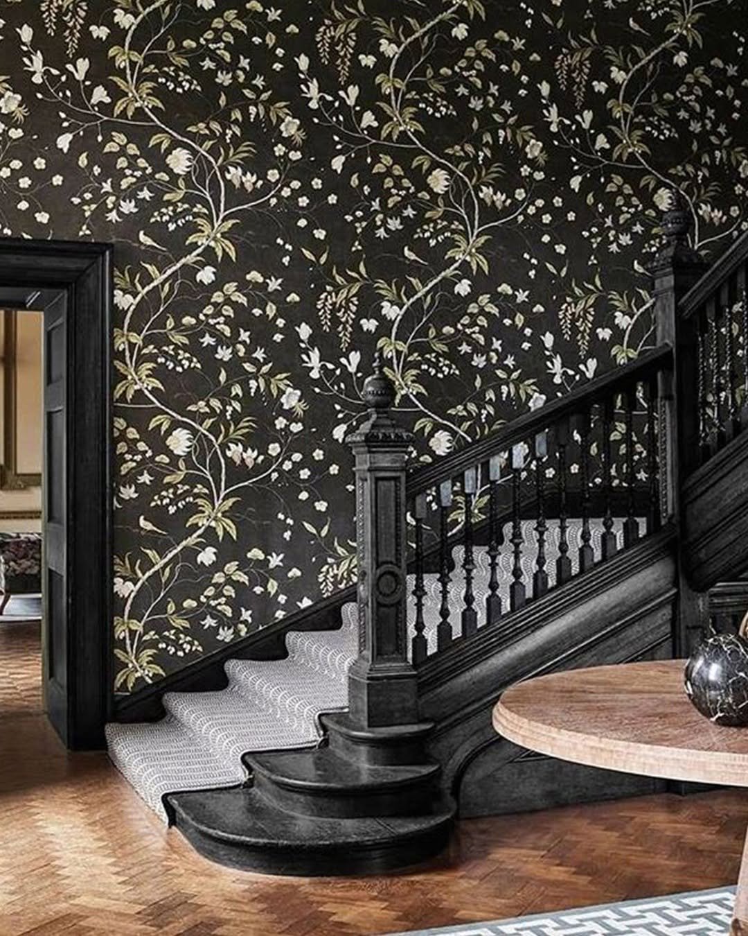 Dark florals climb the walls, wrapping this staircase in pattern and depth. The black woodwork grounds it, while the lighter stair runner softens the look just enough.