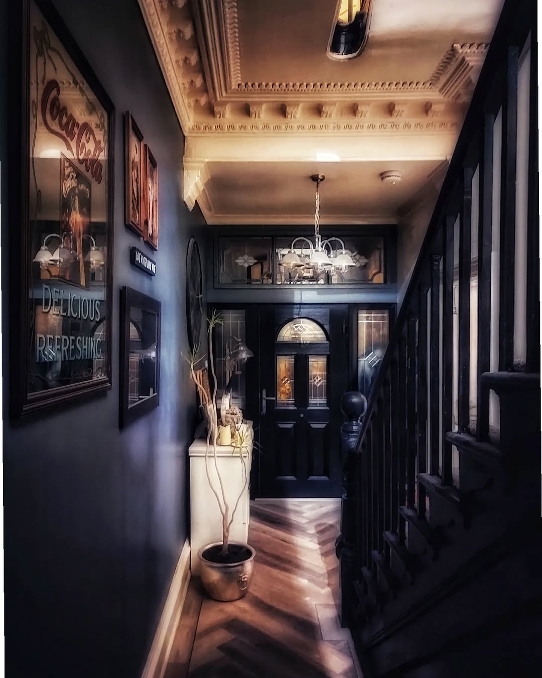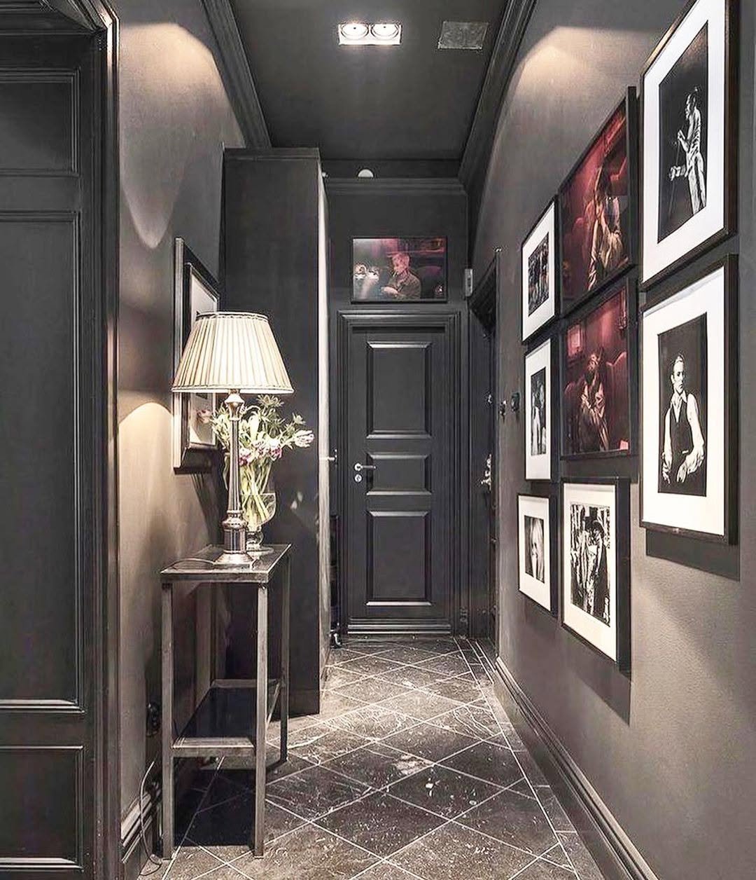 This one feels timeless in a very grounded way. Dark walls, framed artwork, and a slim console table create a hallway that feels collected rather than styled.