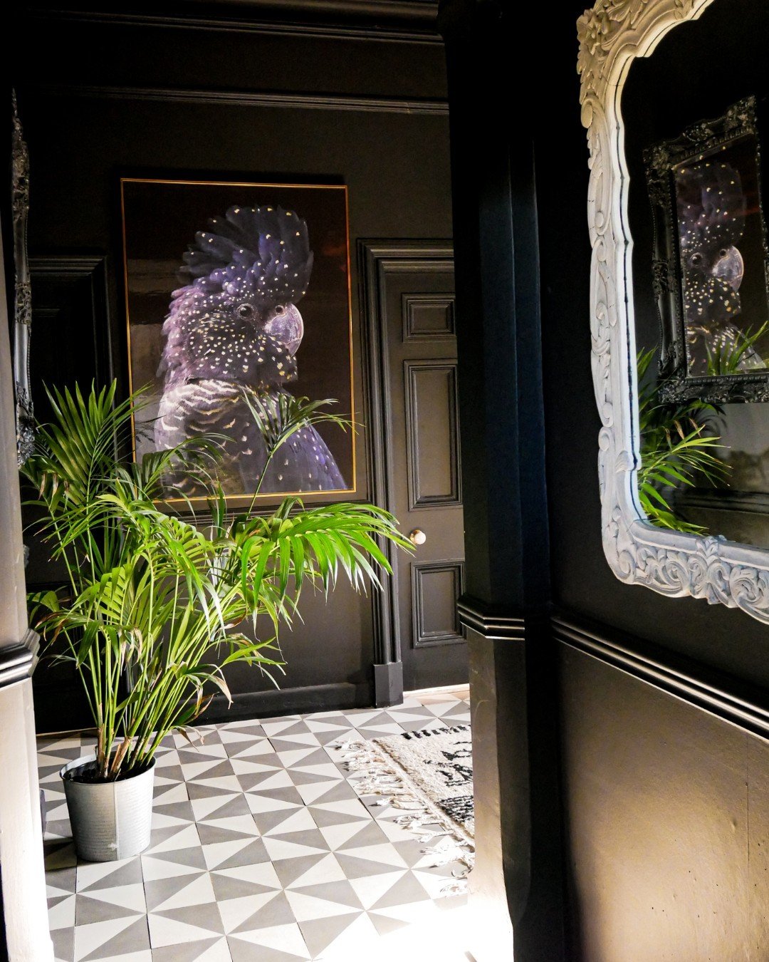 This hallway doesn’t whisper, it makes an entrance. Black walls, bold artwork, and graphic tile floors create a space that feels layered and expressive, like stepping into a curated vignette.