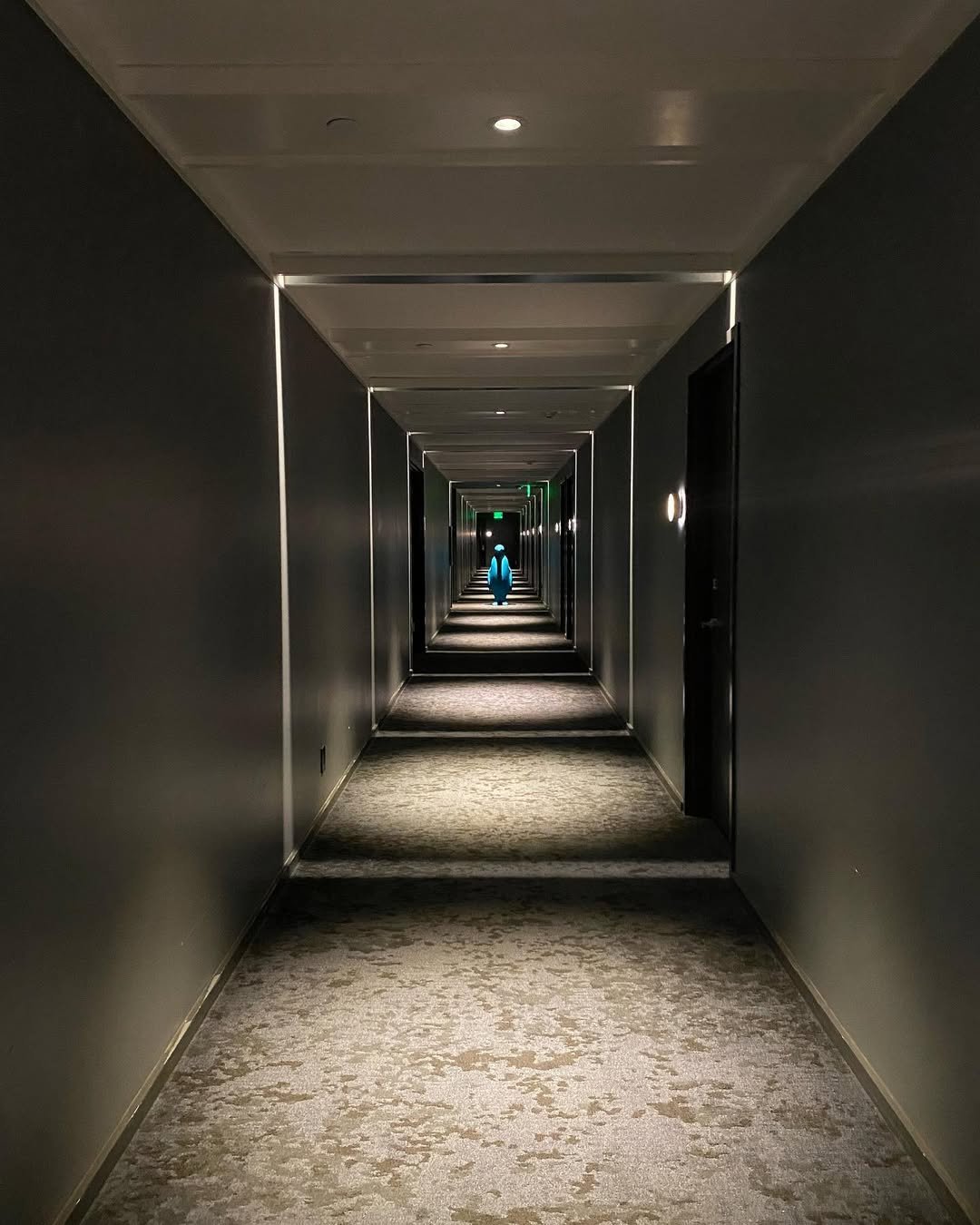 This hallway feels like it stretches on forever, in the best, slightly surreal way. Soft strip lighting frames each section, creating this rhythmic glow that pulls your eye straight down the space. It’s minimal, but not cold, more like a quiet, futuristic hotel moment.