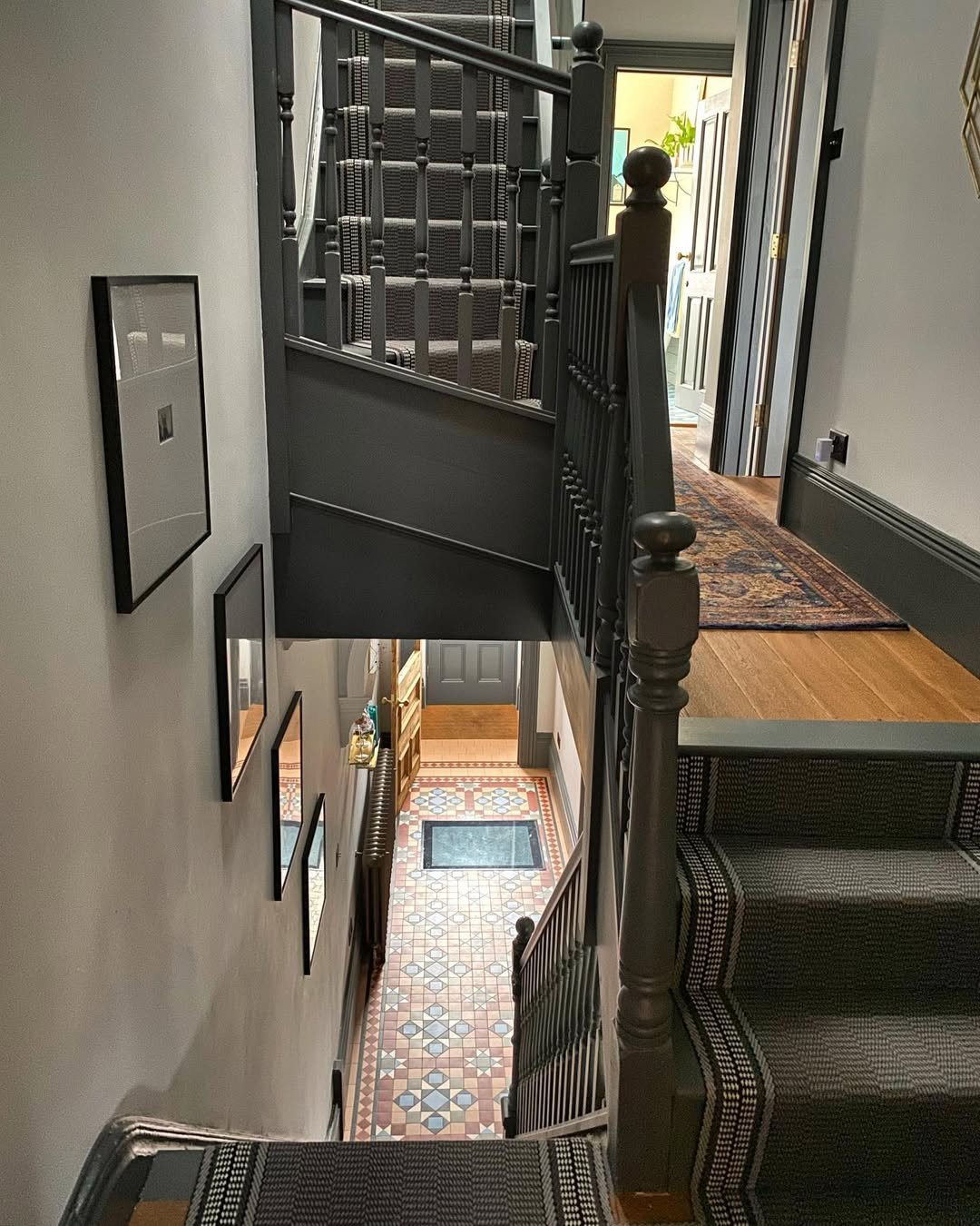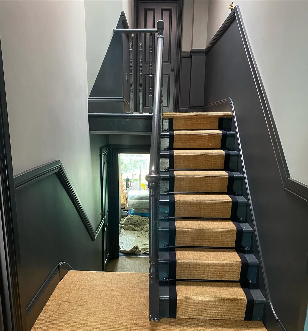 There’s something undeniably polished about a dark staircase done right, and this one leans all the way in. Deep charcoal paneling wraps the space, while that woven stair runner brings in just enough texture to soften the edges. It feels structured, almost tailored, like a well-cut coat in a hallway form.