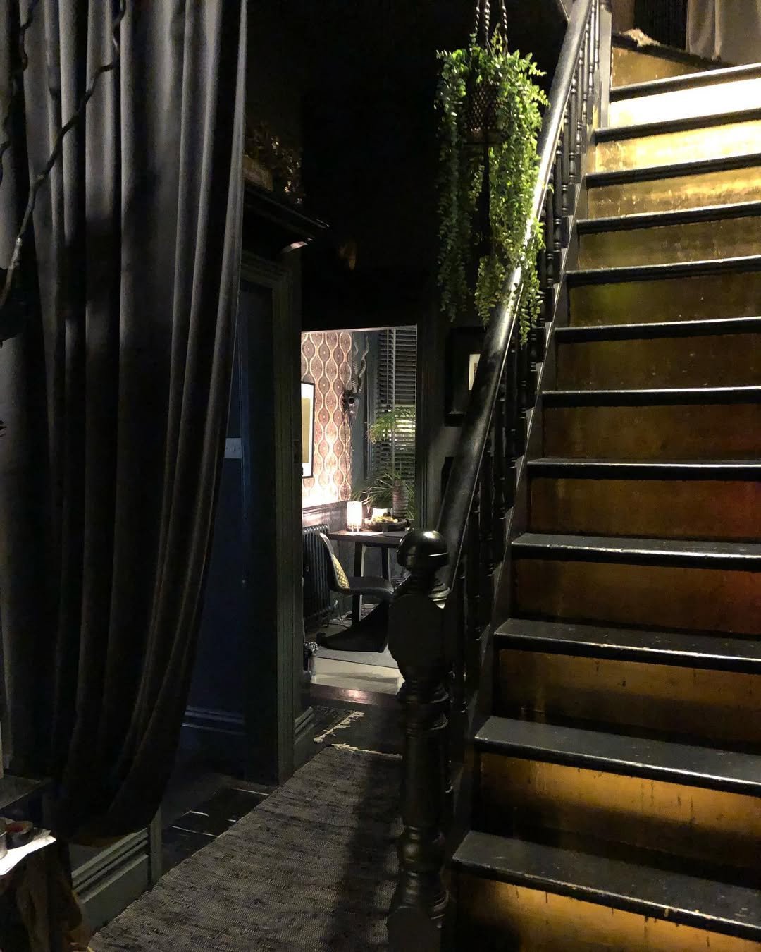 Low light, dark tones, and a hint of gloss on those stairs, this space leans all the way into mood. The shadows do most of the work, while the greenery adds just enough life to keep it from feeling too heavy.