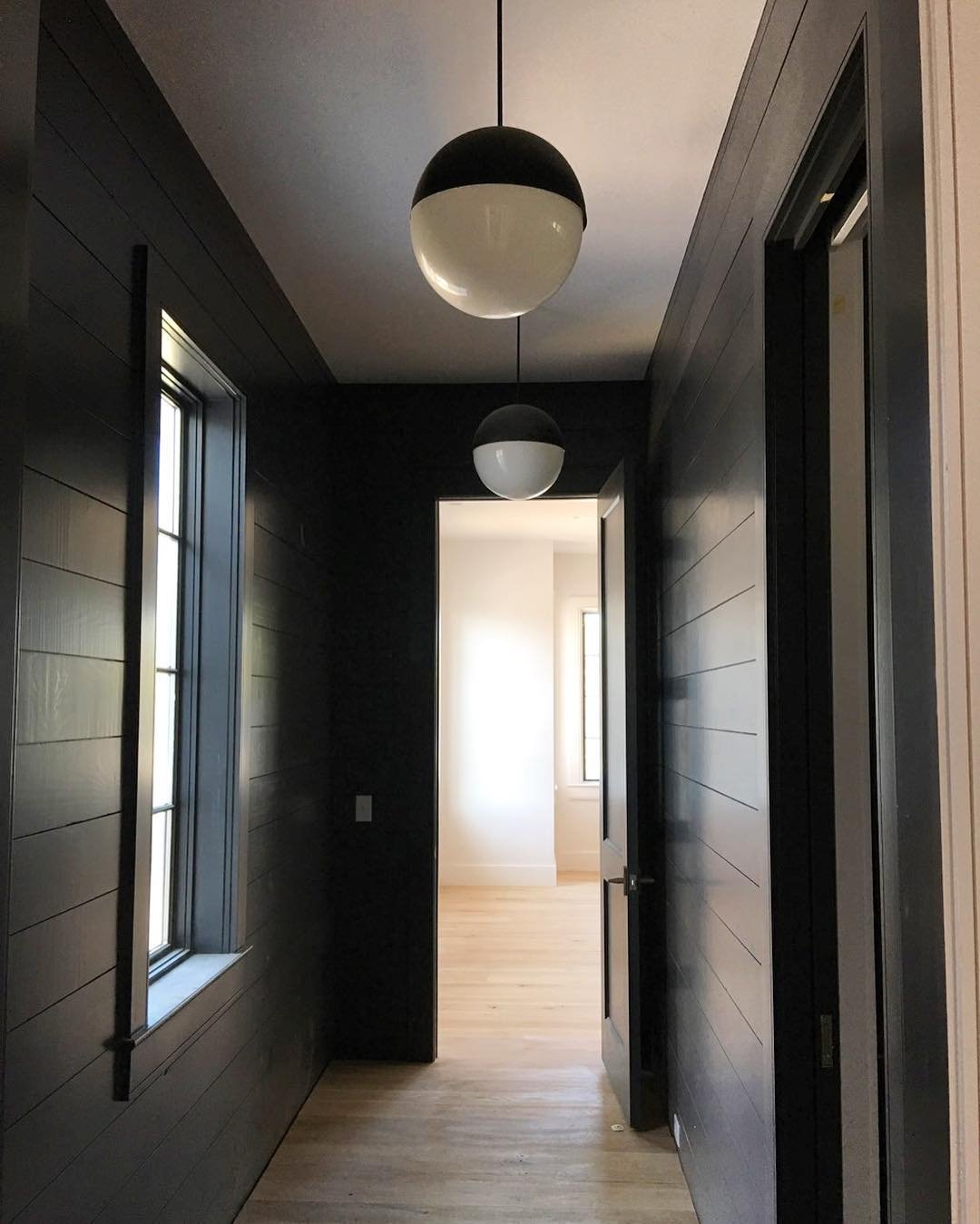 There’s a quiet confidence in this one. Matte black walls, simple paneling, and those globe pendants create a look that feels modern without trying too hard.