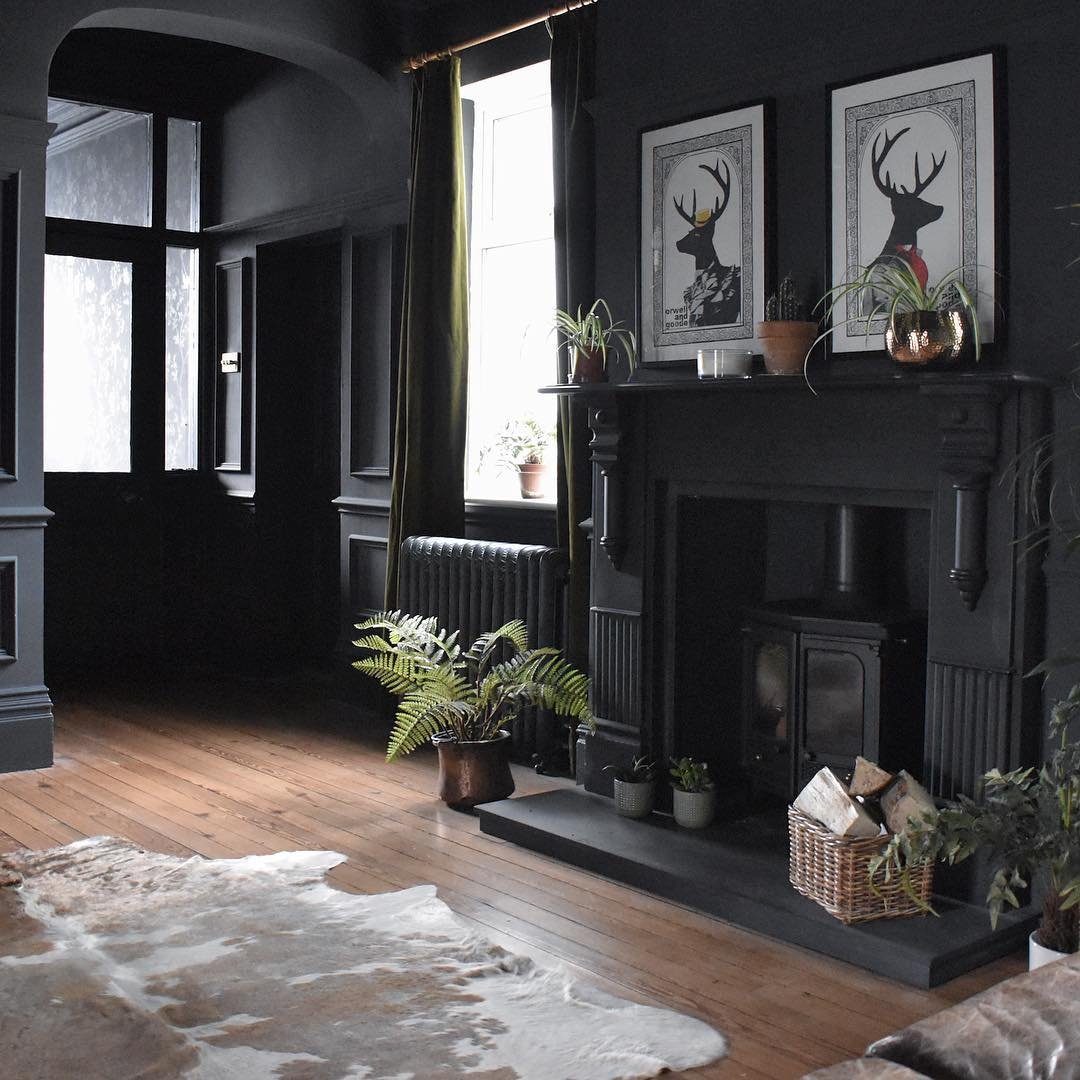 This space leans into tradition, but with a darker, richer palette. Deep walls wrap around the fireplace and woodwork, letting the textures do the talking, from the worn floorboards to the soft hide rug.