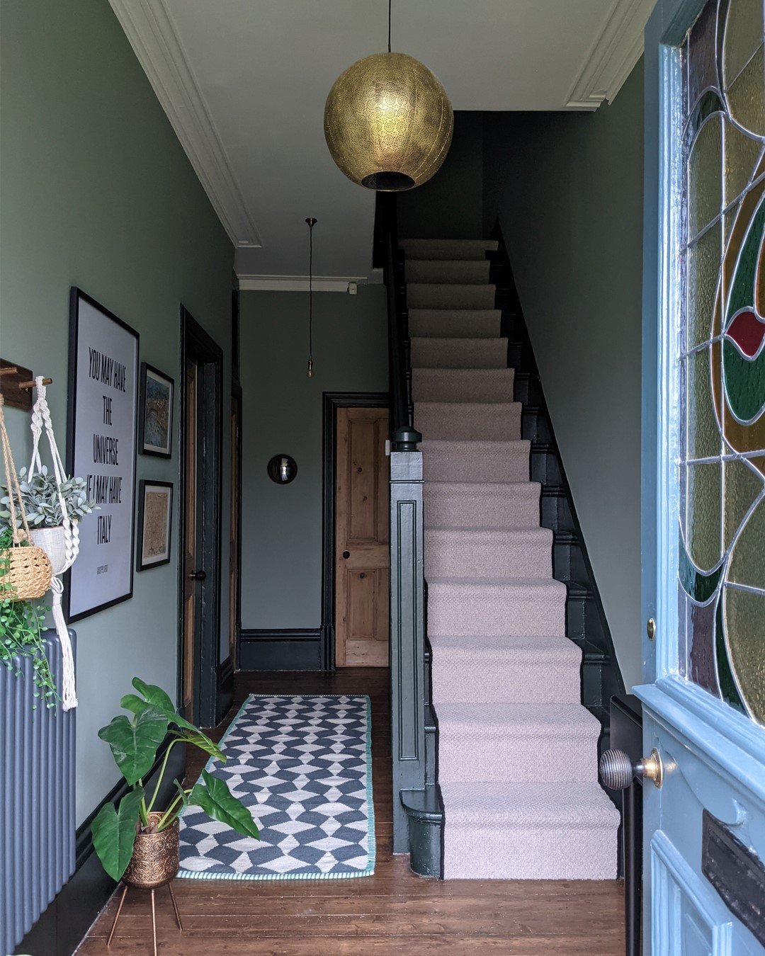 This hallway plays with color in a softer way. The muted olive walls add depth without going fully dark, while the staircase and trim keep things grounded.