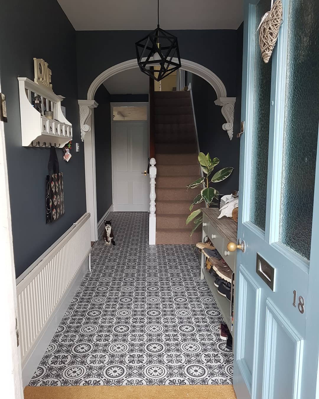 There’s something instantly charming about a hallway that leans into pattern like this. The tiled floor sets the tone, while the deep walls and white trim frame everything in a way that feels classic yet full of life.