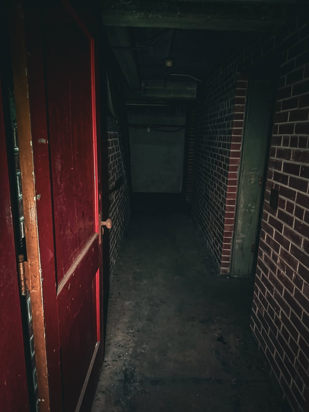 There’s an honesty to this space that feels almost cinematic. Exposed brick, worn concrete, and that slightly open red door create a scene that feels untouched and a little mysterious.