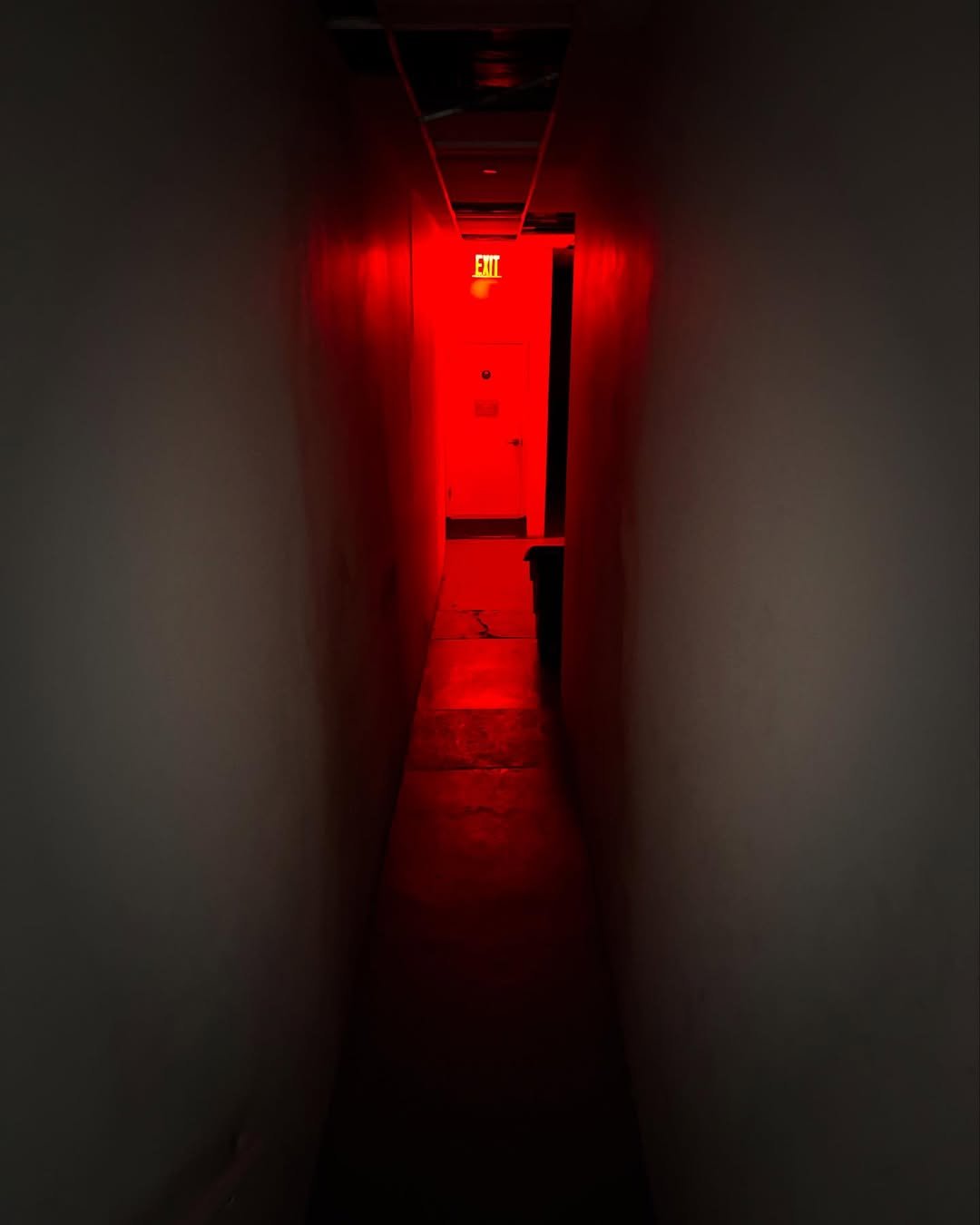 This narrow corridor feels like stepping into a thriller scene. Saturated red light floods every surface, pulling your eye straight to that glowing exit sign, like a promise you’re not quite sure you trust.