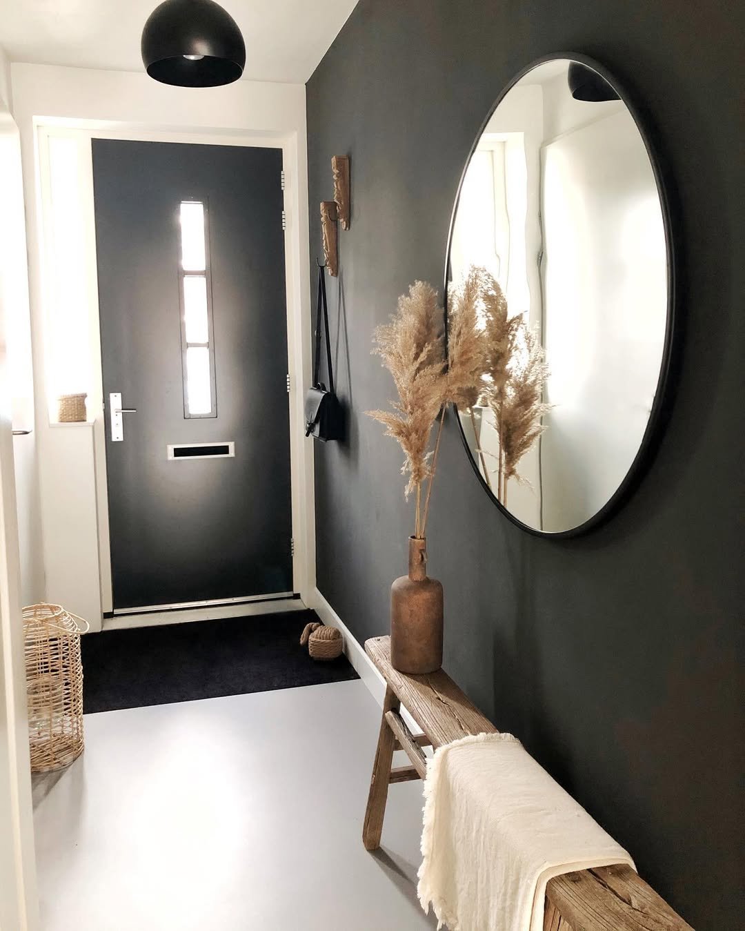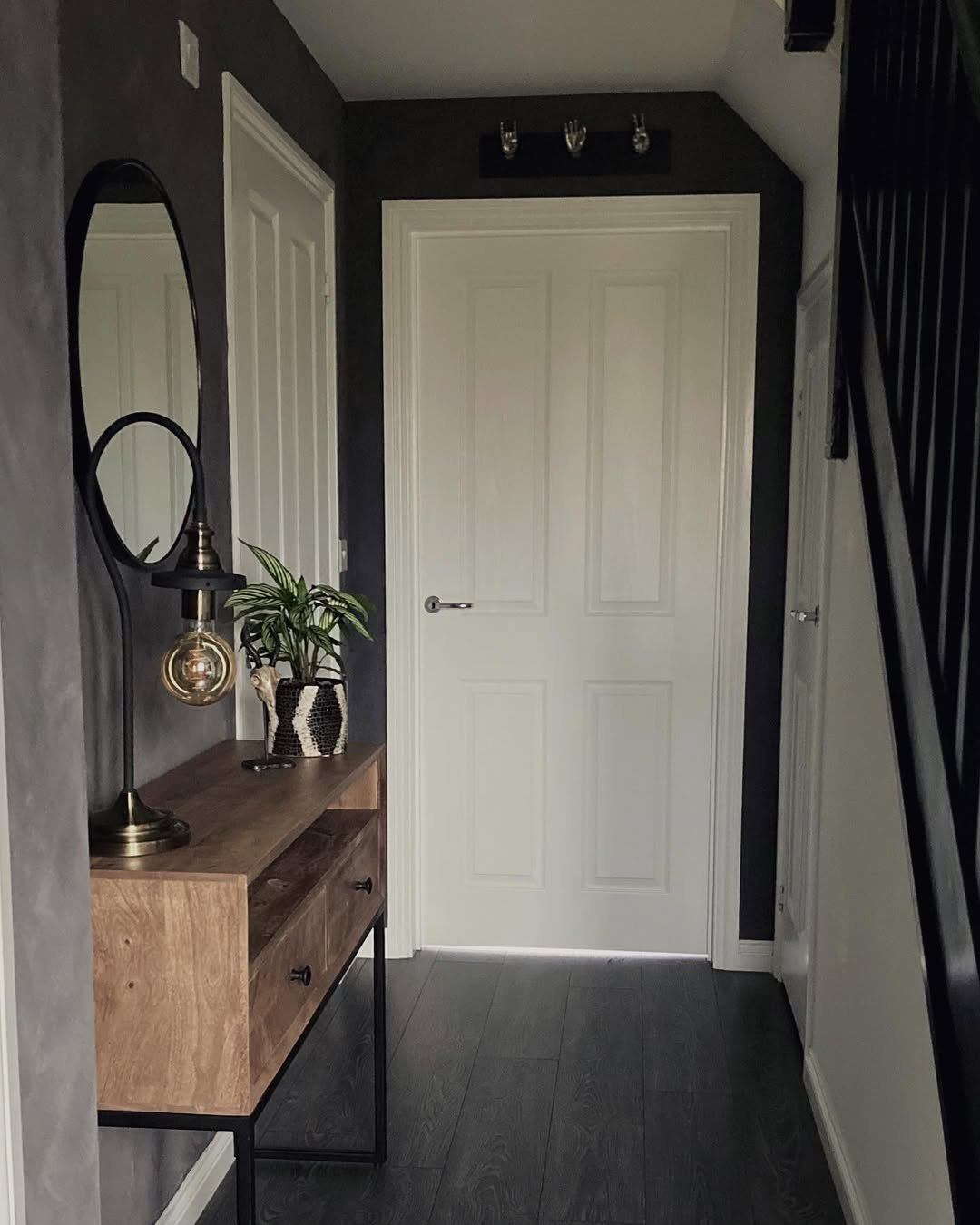 This hallway plays with contrast in a softer way. Dark walls meet a light door, and the wooden console adds warmth without overpowering the space.