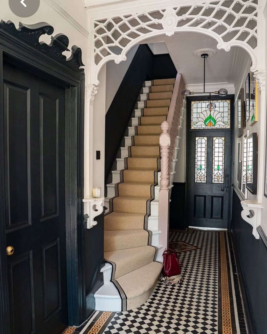 This one blends classic architecture with a bold, grounded palette. Dark staircase details, patterned tile flooring, and a touch of softness in the seating create a hallway that feels both practical and styled.