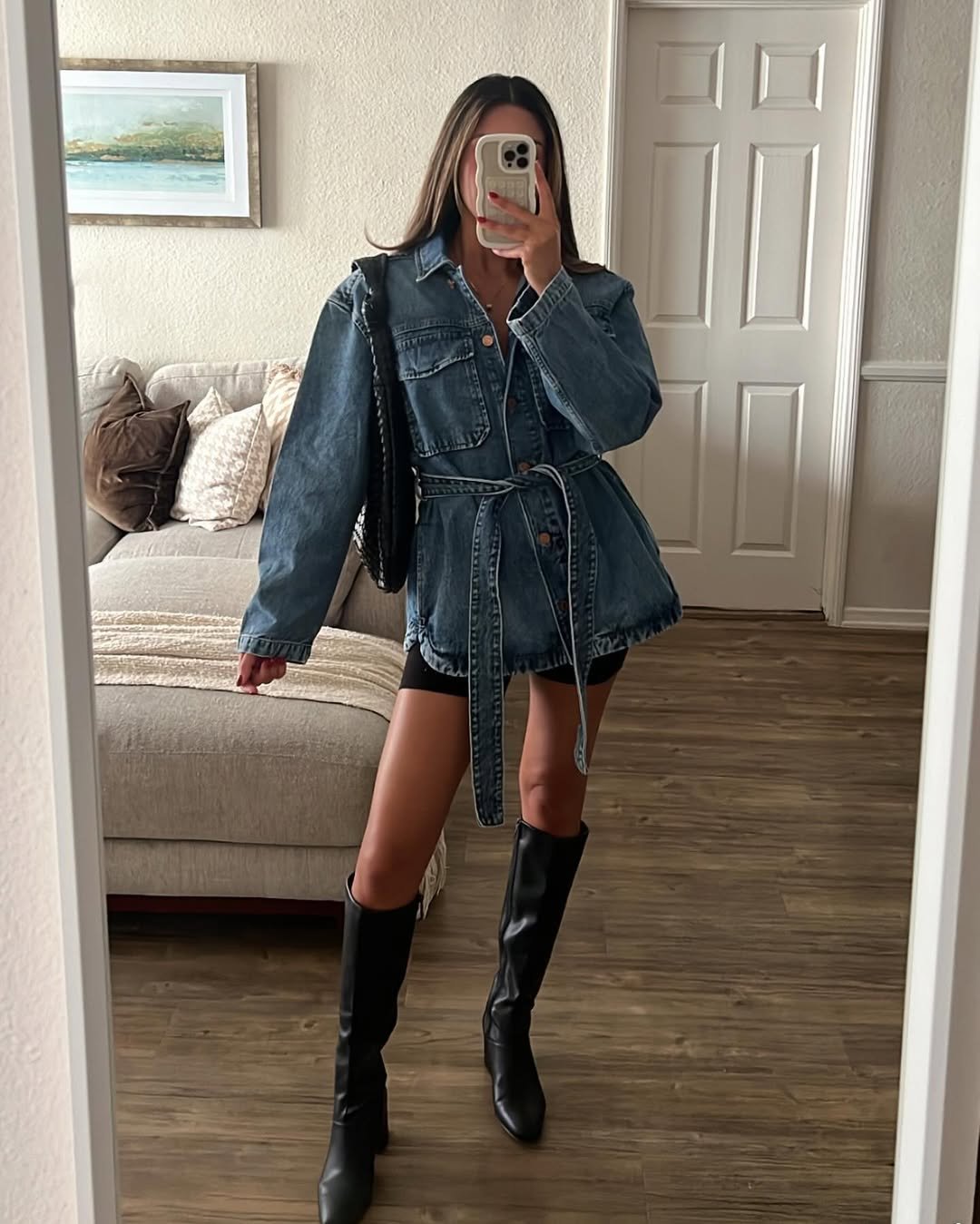 Turning a denim jacket into a statement piece with a waist tie? Genius. Worn almost like a dress with knee-high boots, it shifts the vibe from casual to confident in seconds.