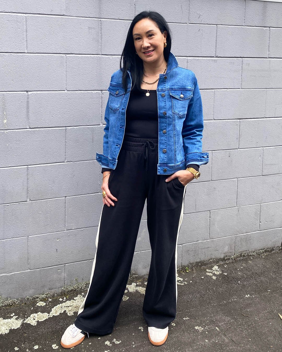 This is how you elevate basics. A classic medium-wash denim jacket layered over a sleek black set instantly sharpens the silhouette without trying too hard.
