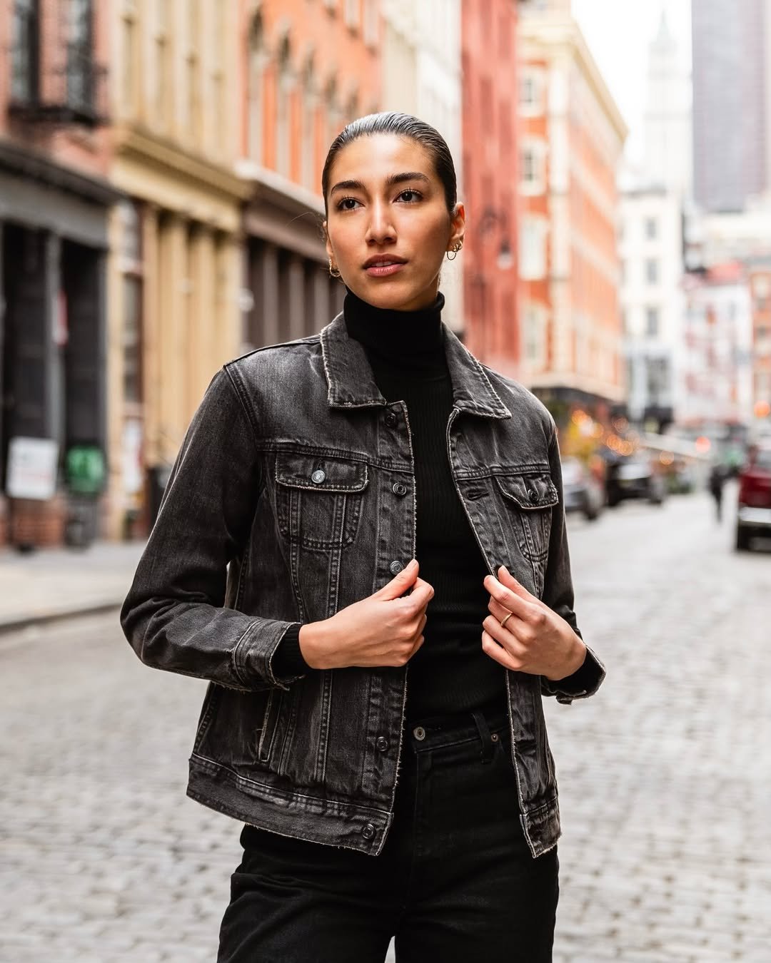 A charcoal denim jacket layered over a black turtleneck on a cobblestone street? Timeless. Clean. Sharp.