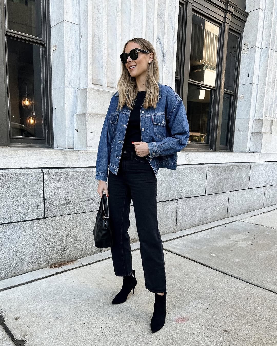 You can never go wrong with a dark denim jacket over an all-black base. The clean lines, cropped jeans, and pointed booties make it feel sharp and modern.