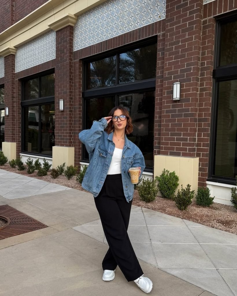 Oversized denim jacket, white tank, and flowy black trousers—it’s the holy trinity of “cool without trying.” The chunky sneakers and iced coffee just complete the mood.