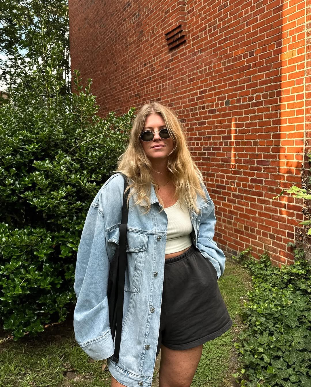 An oversized light-wash denim jacket with biker shorts and a cropped tank is peak off-duty model energy. The relaxed fit keeps it laid-back, while the sunglasses add instant attitude.