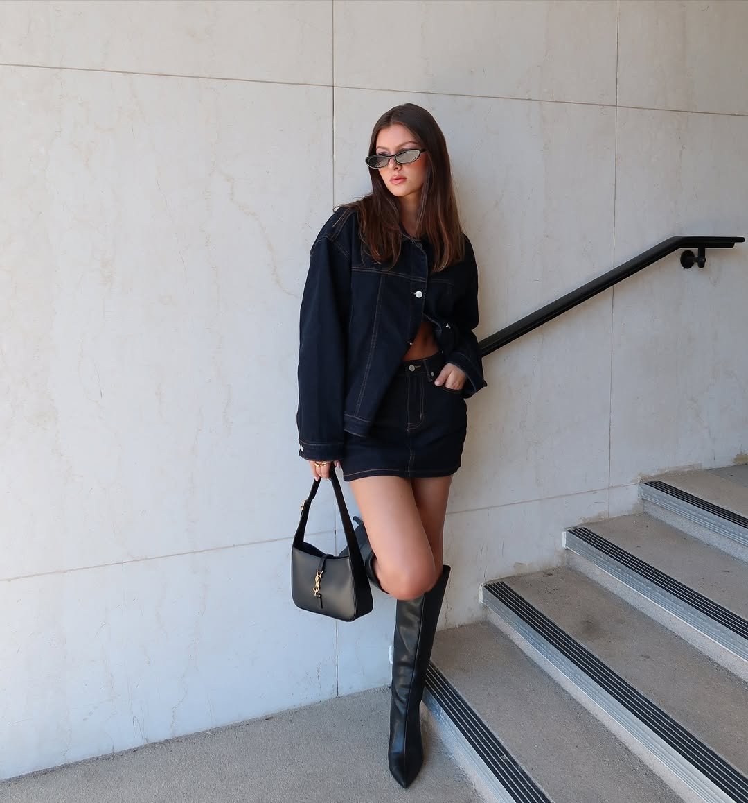 Black denim set. Mini skirt. Structured jacket. Knee-high boots. This is sleek, sharp, and slightly mysterious in the best way.