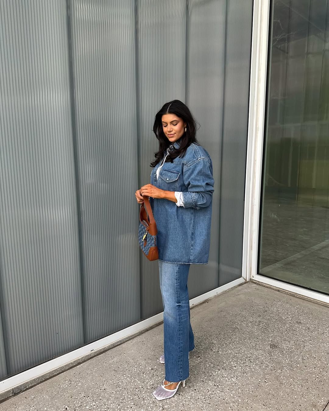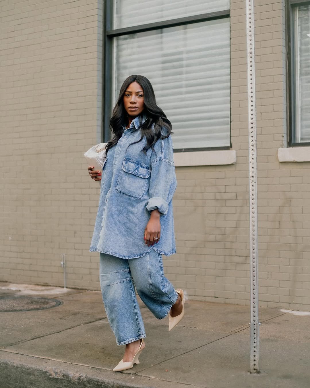 An oversized denim shirt styled with wide-leg jeans and sleek pointed heels is such a smart silhouette play. Relaxed on top, structured at the bottom.