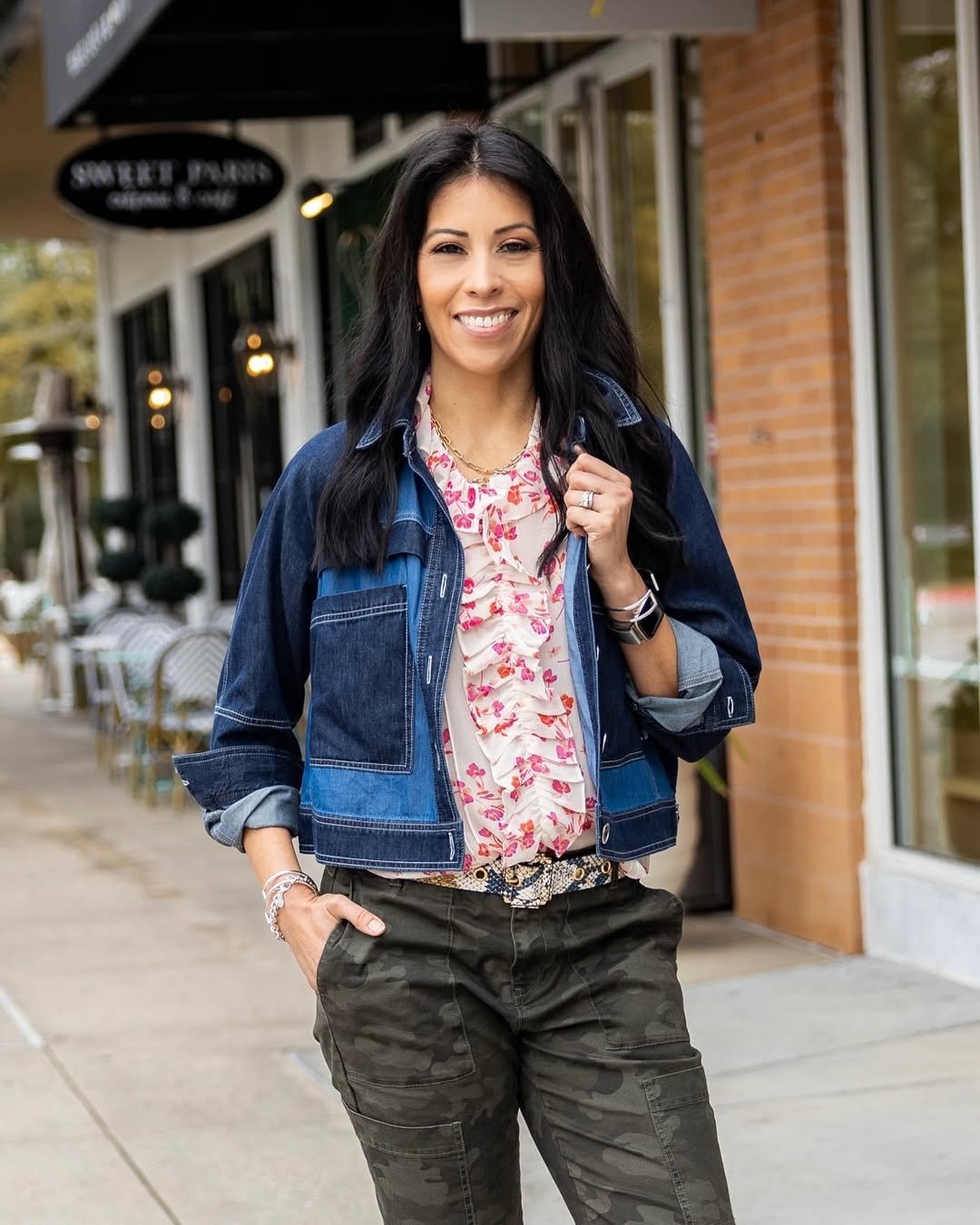 This is how you make a denim jacket feel elevated. A floral blouse underneath adds movement and personality, while the camo pants bring in that unexpected edge.
