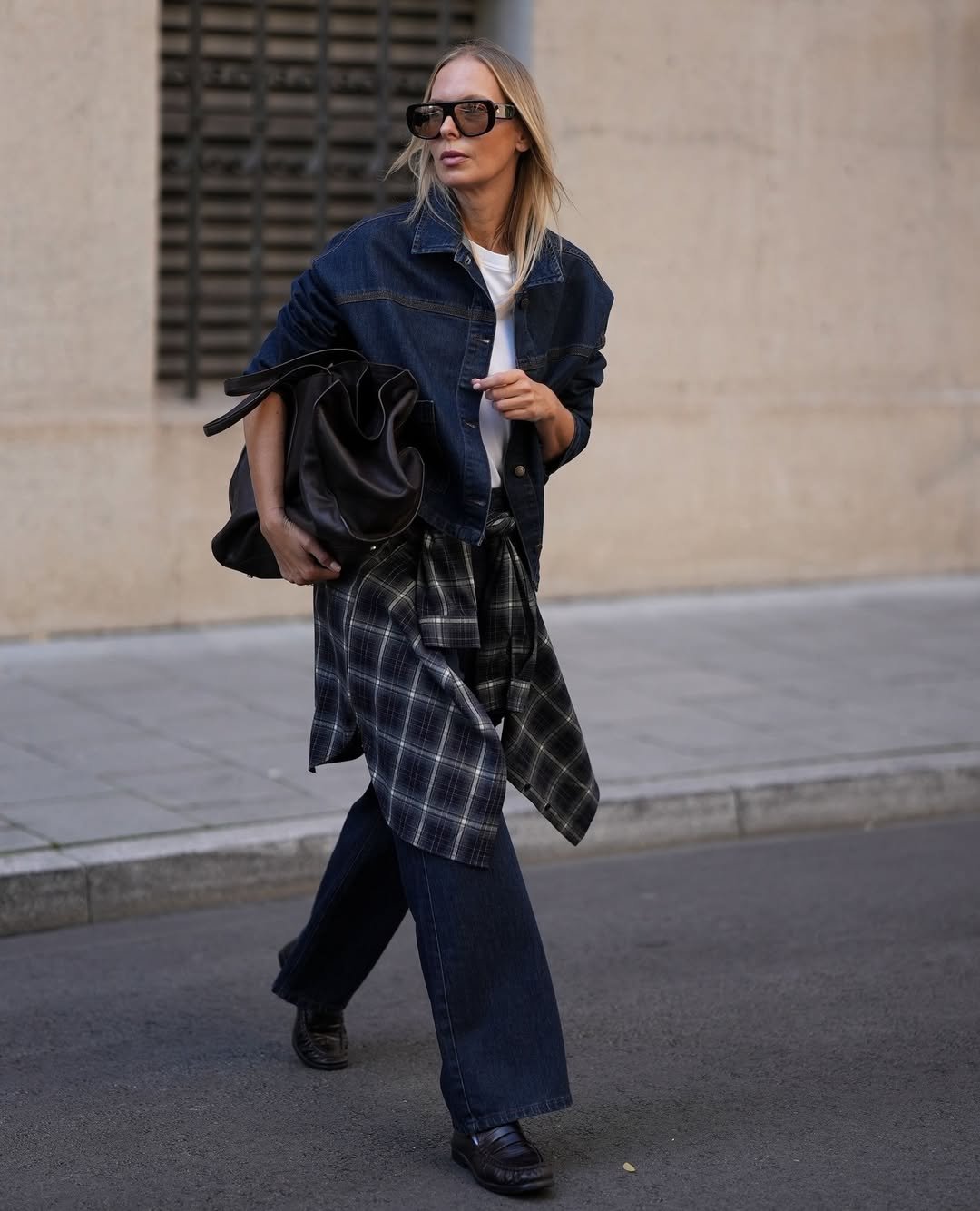Dark denim jacket, crisp white tee, wide-leg jeans, and loafers—it’s timeless with a twist. The plaid shirt tied at the waist adds depth without overcomplicating things.