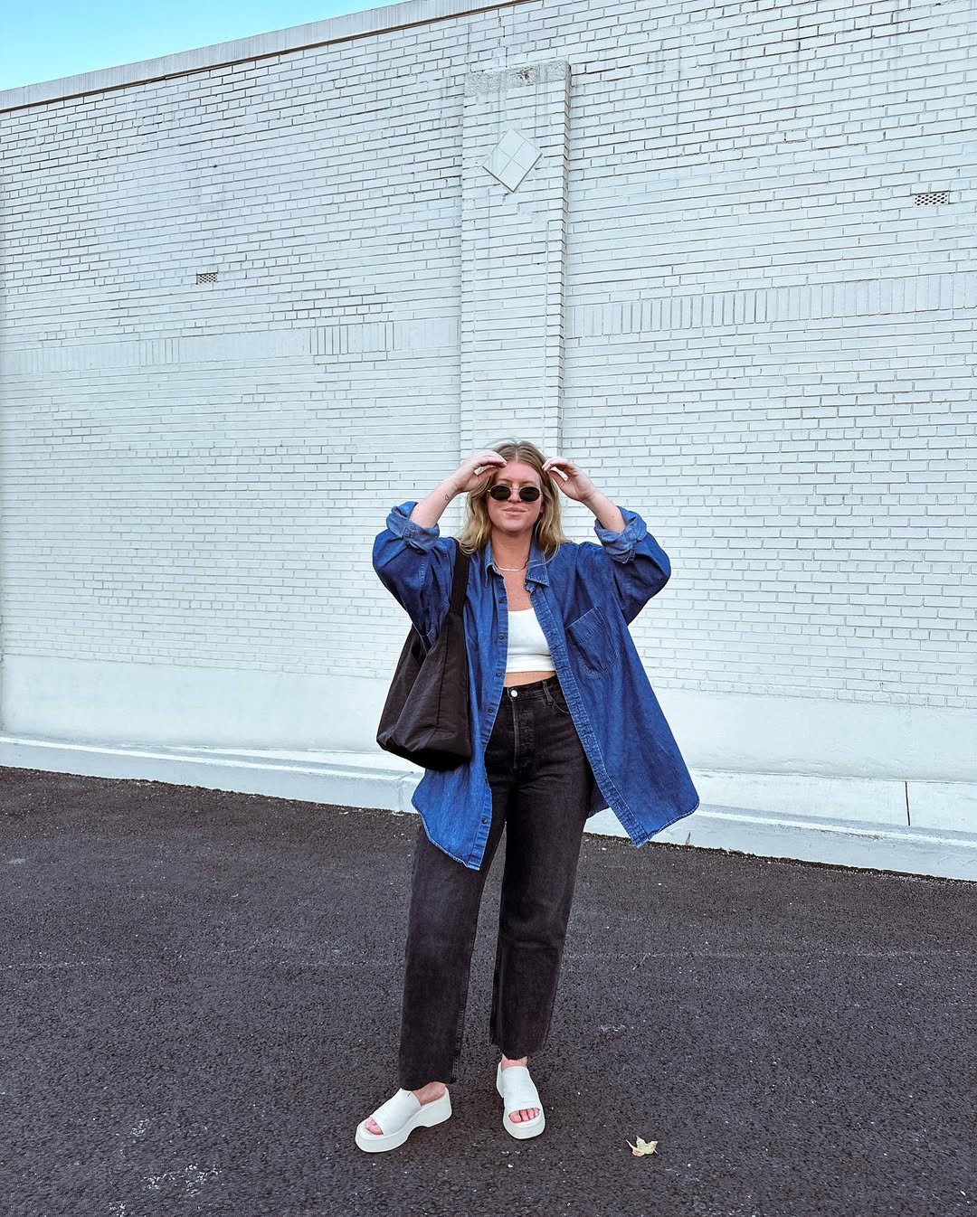 Switch the jacket for an oversized denim shirt and suddenly the whole look softens. Paired with straight-leg black jeans and chunky slides, it’s easygoing but styled.