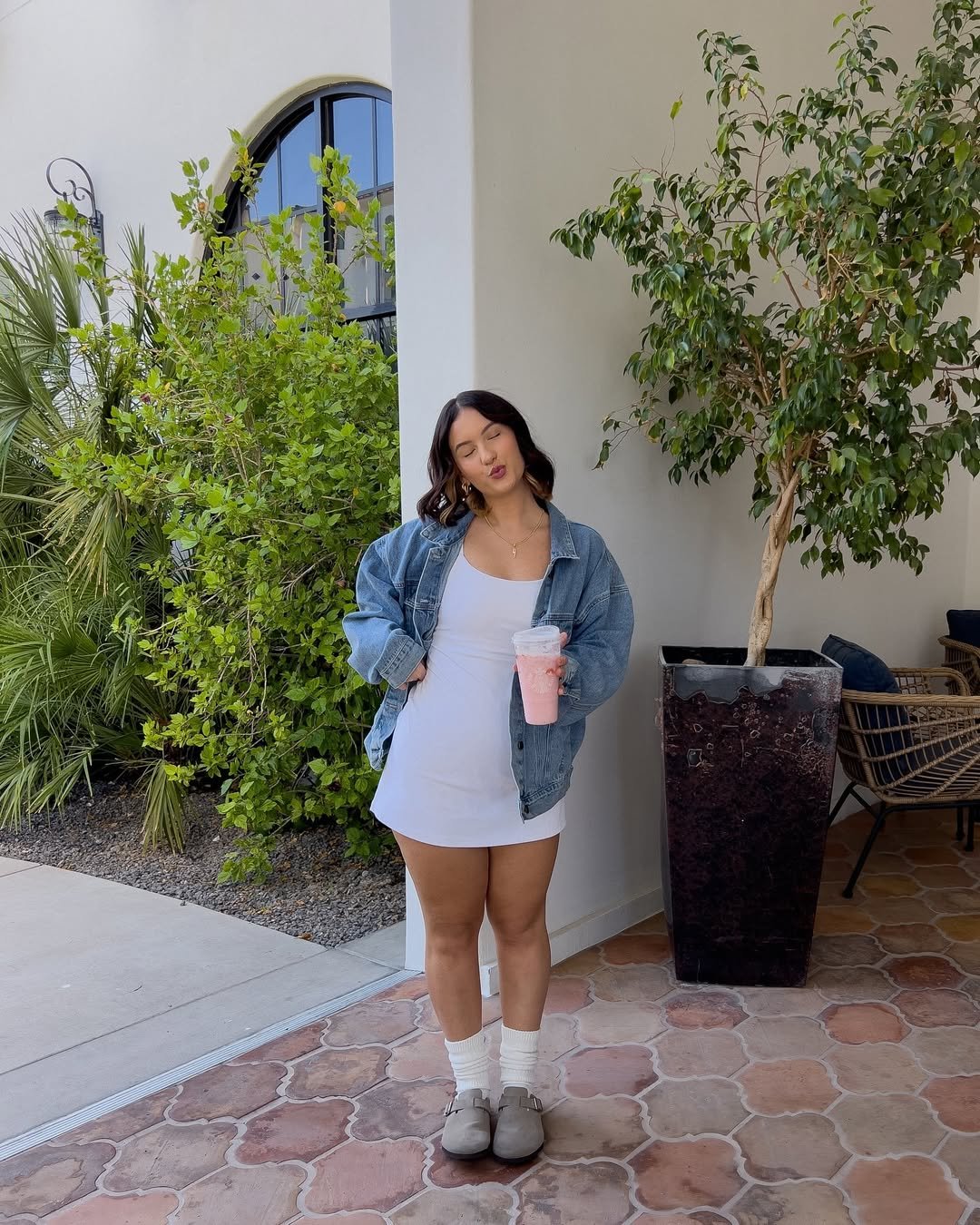 Here, the denim jacket meets a fitted white mini and cozy socks with clogs. It’s relaxed, slightly playful, and very current.